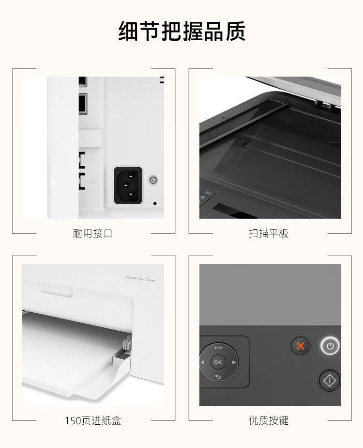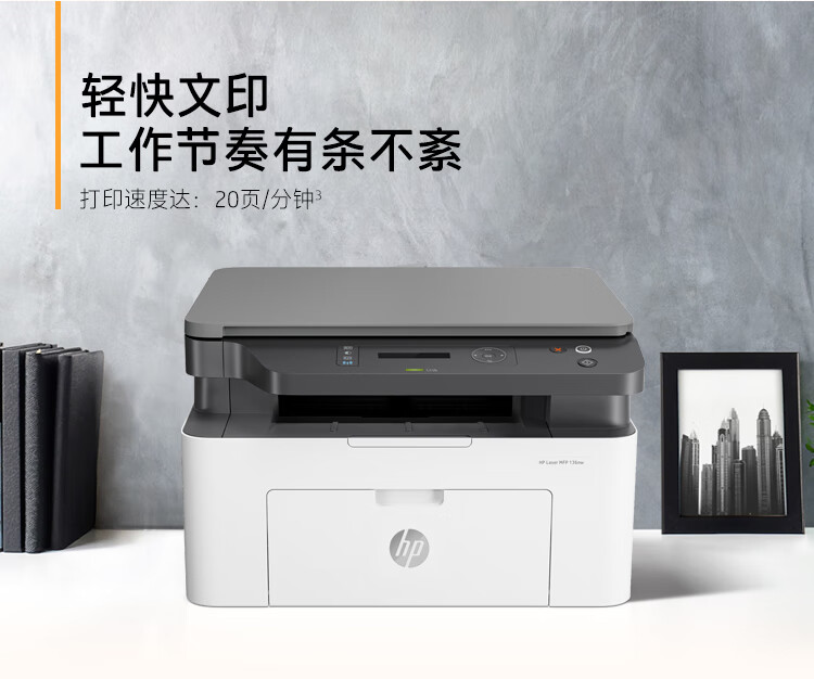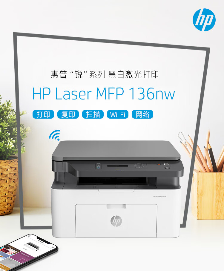 惠普(HP)136nw 黑白激光打印机 办公家用 打印/复印/扫描 多功能一体机 有线+无线wifi A4幅面