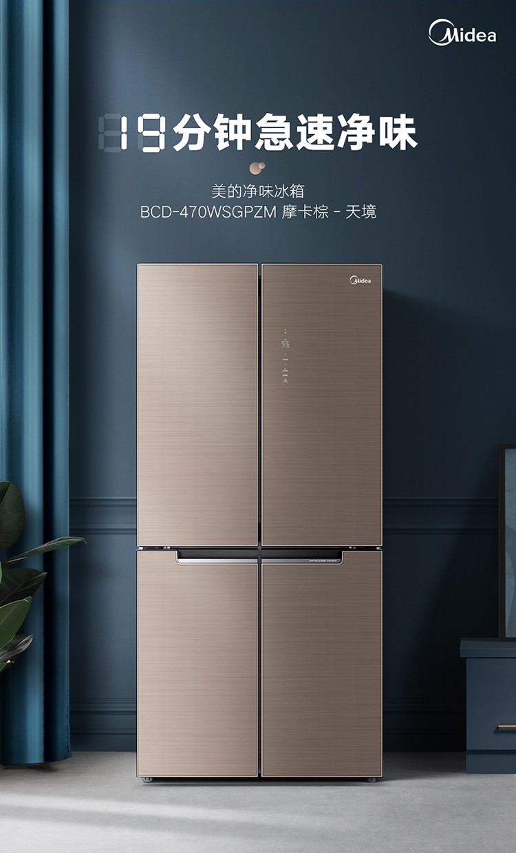 美的(Midea)19分钟急速净味 470升 十字对开门家用冰箱 智能操控 三档变温 温湿精控 BCD-470WSGPZM 商场同款
