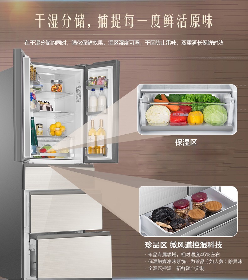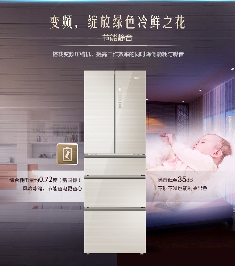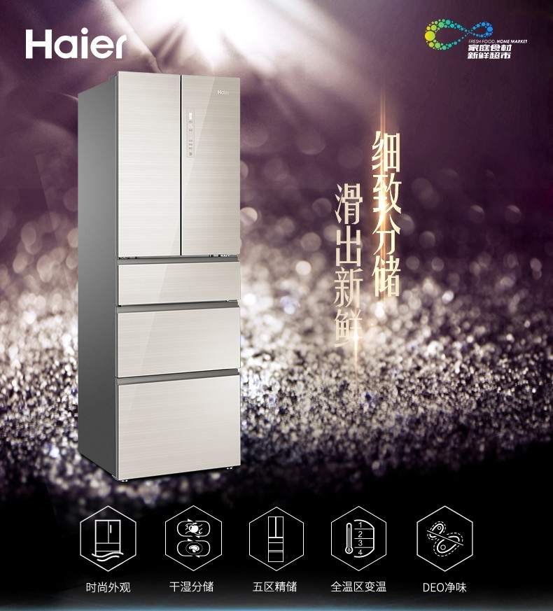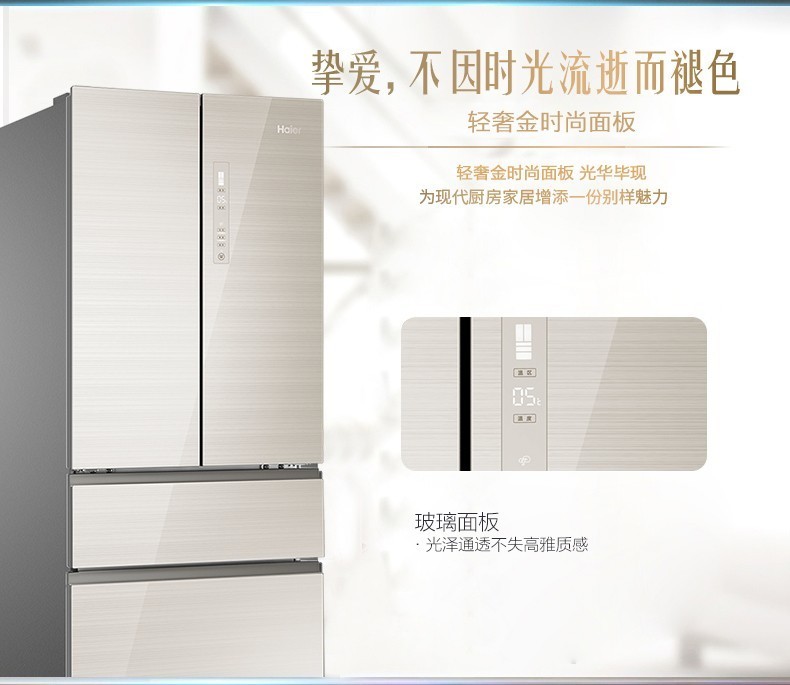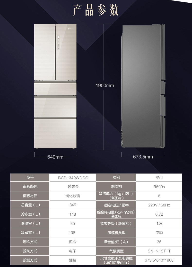 海尔(Haier)冰箱智能双变频一级能效 349升钢化玻璃多门风冷无霜 干湿分储变温软冷冻零度保鲜 BCD-349WDCO轻奢金