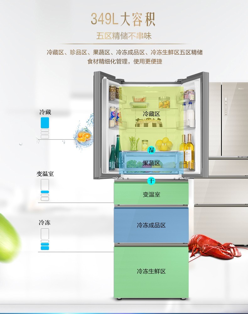海尔(Haier)冰箱智能双变频一级能效 349升钢化玻璃多门风冷无霜