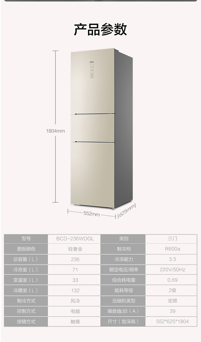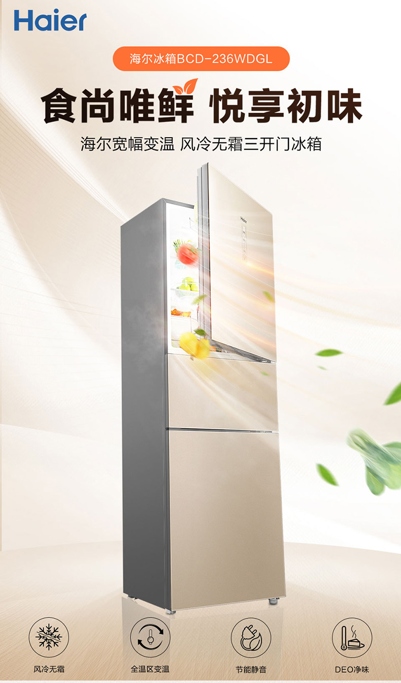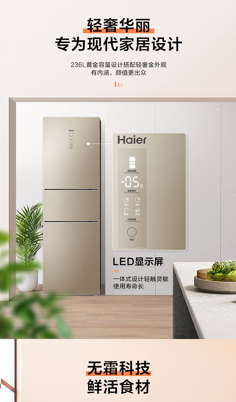 海尔(Haier)三门冰箱 风冷无霜 净味保鲜 -7摄氏度软冷冻 钢化玻璃面板 家用客厅厨房小冰箱 新款轻奢金独立全变温BCD-236WDGL